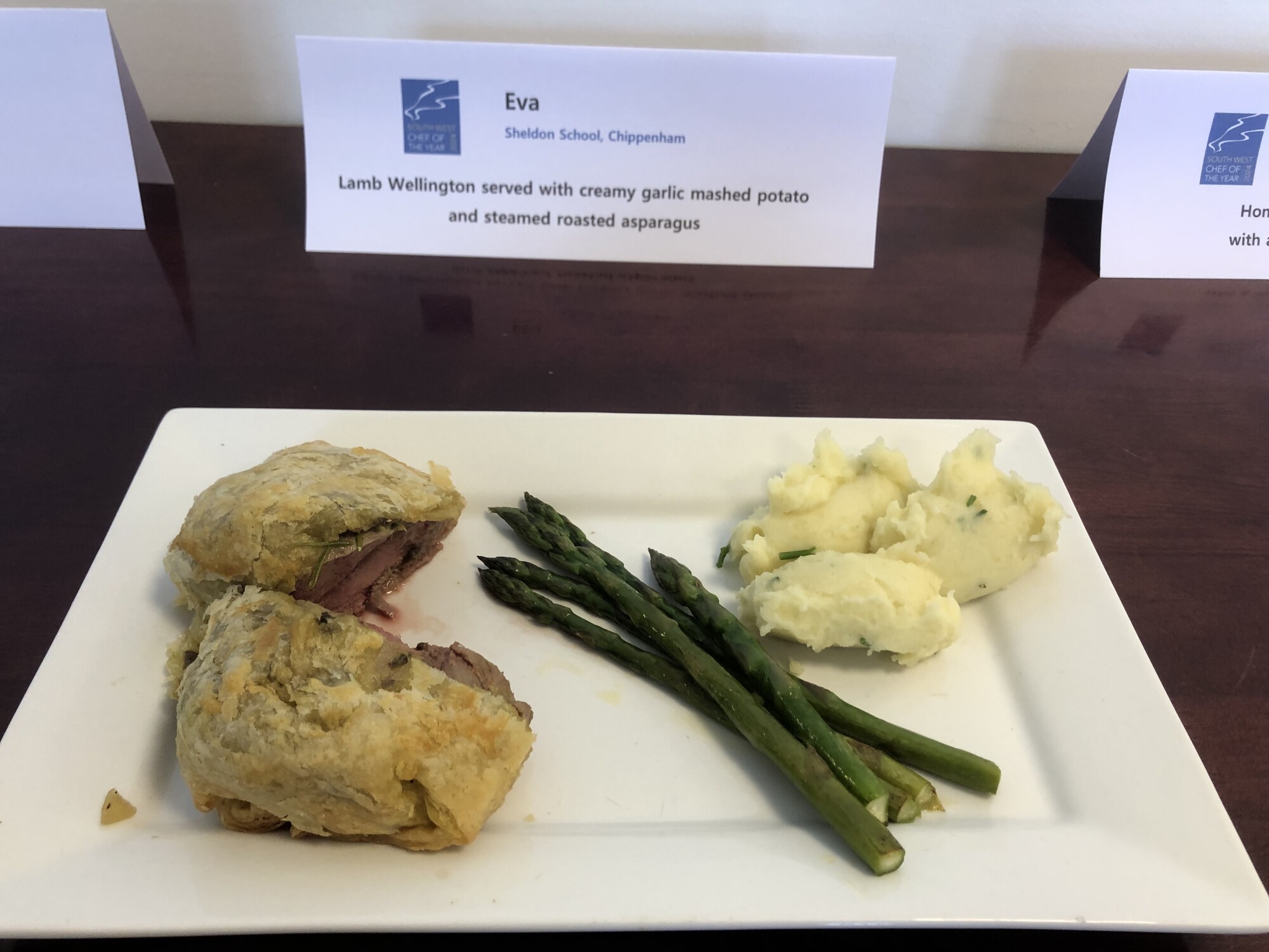 The judges were impressed by Eva's local lamb Wellington with a creamy mushroom topping served with a chive and garlic mash along with steamed asparagus. They said it was the most challenging dish made during the competition.